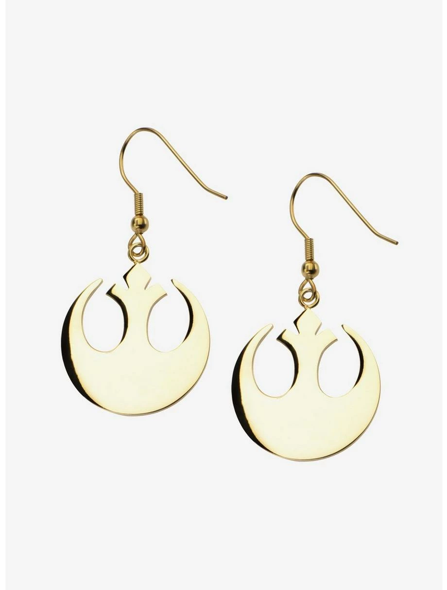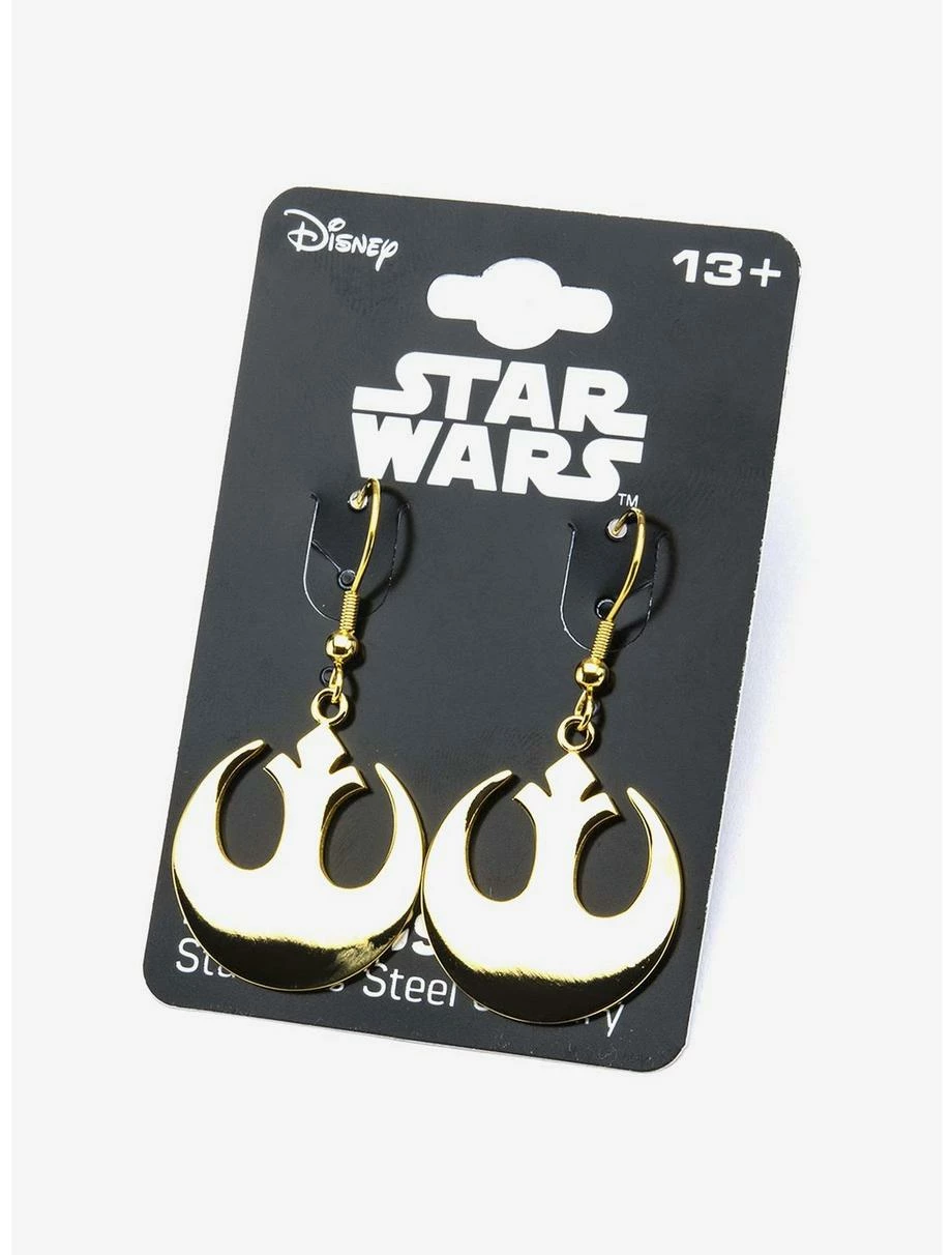 Stainless steel Star Wars gold plated Rebel Alliance symbol hook dangle earrings. Licensed jewelry packaging included. Dimensions: 1.75″ Length x 1″ Width x 0.063″ Height.